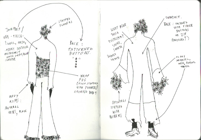 Some design ideas/sketches for my project 'Eating Nature'. I really like jumpsuits because I feel like I can exaggerate and play around with symmetry (or a-symmetry) and the heaviness. I decided to do long, extended sleeves and legs to accentuate a kind of heaviness and drag towards to ground and the earth. Also using thicker, heavy fabrics accentuate this feeling. So basically I'm just playing around n thinking and hopefully will start to produce segments of it soon.